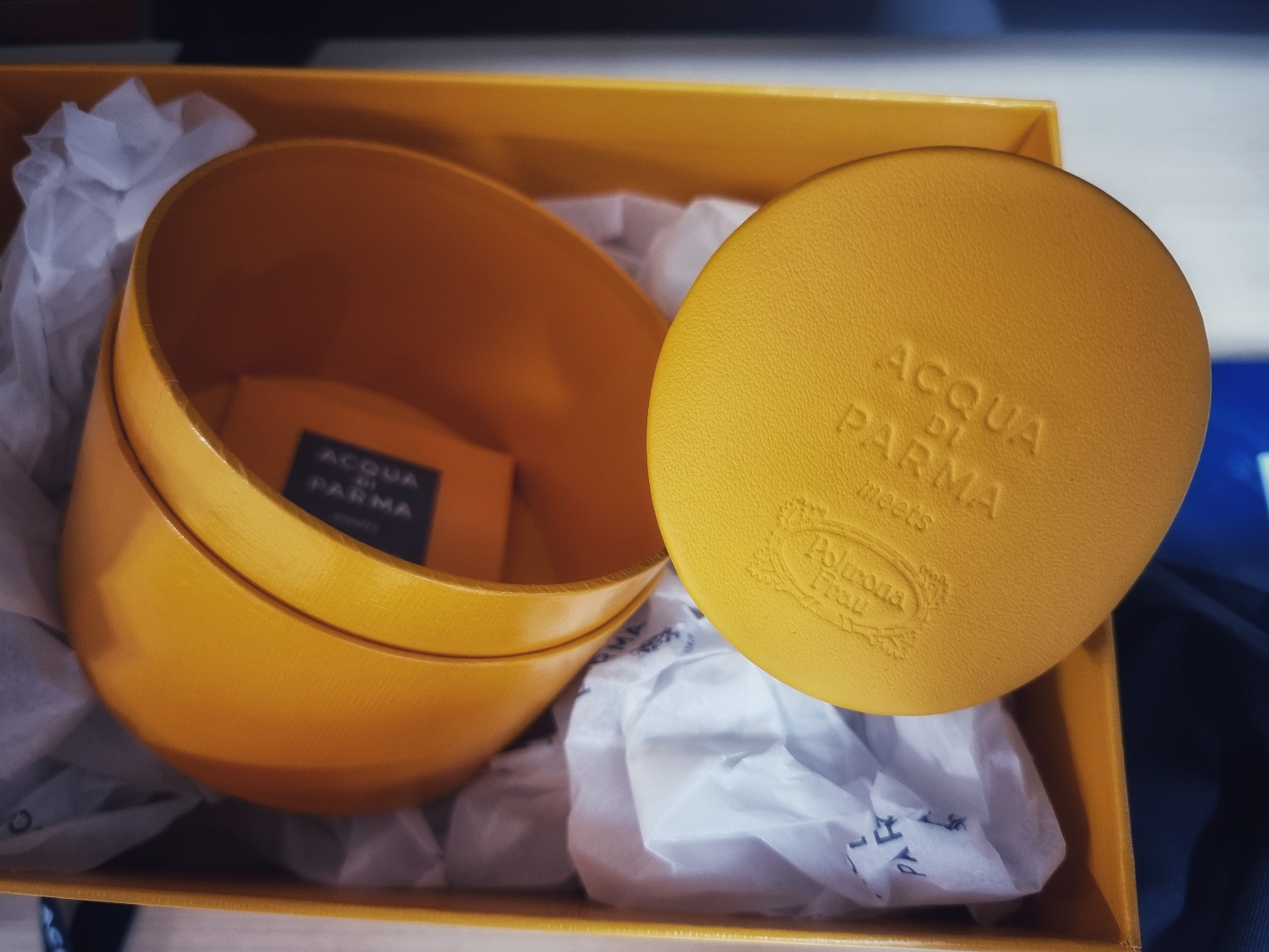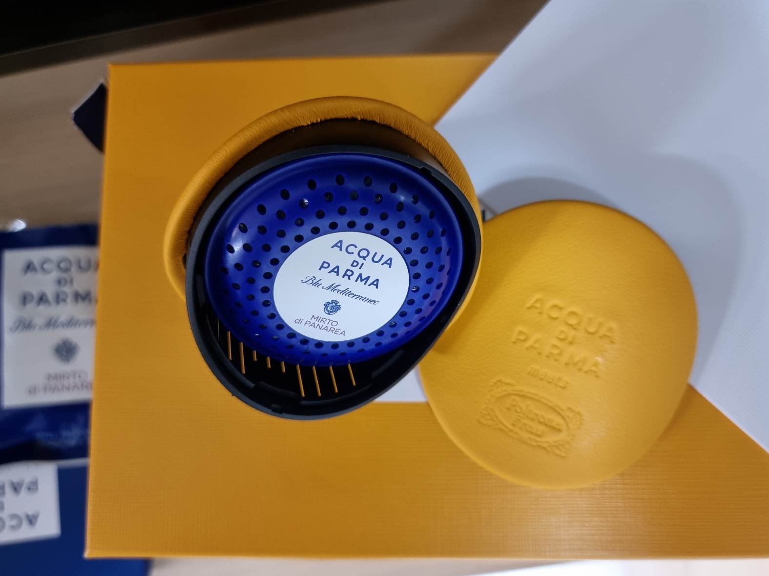 케이스를 오픈하면 노란색 원통 박스와 네모난 파란 박스가 보인다. 원통 박스에는 가죽으로 만들어진 차량용 방향제 케이스, 네모난 파란 박스에는 카트리지가 있다. 자동차를 구매했는데 고급스러운 가죽 케이스와 방향제를 선물 받는다면 분명 센스 있는 사람으로 기억에 남을 것이다. 방향제 케이스가 강렬하지 않으면서 선명한 노란색이 마음에 들었다.
