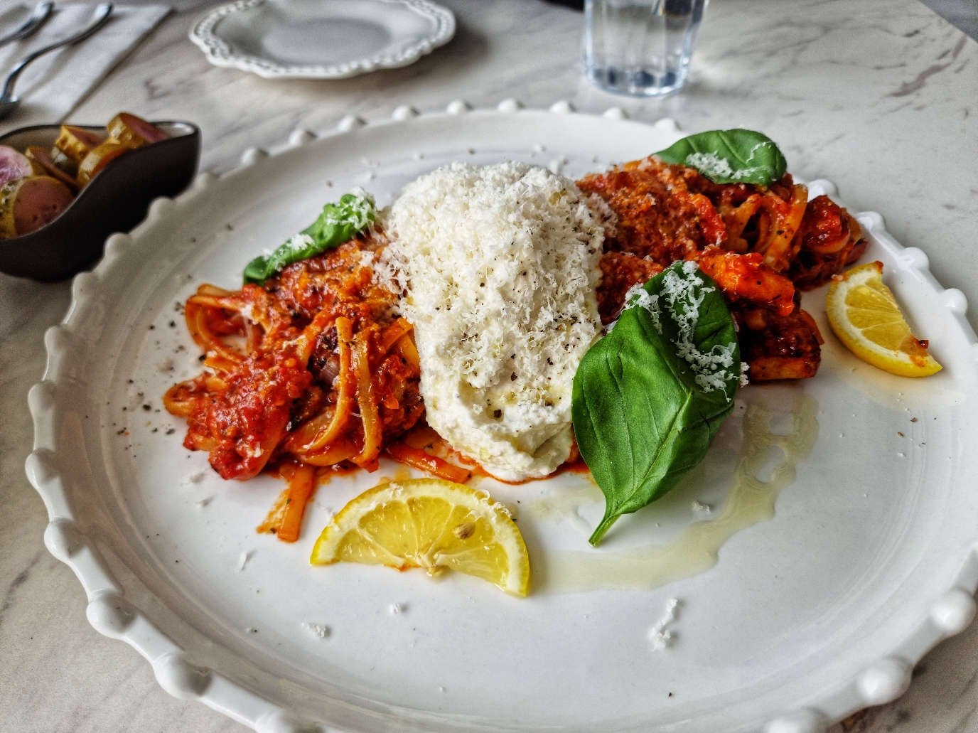 아마트리치아나는 매콤한 맛으로 부라타치즈와 두툼한 베이컨이 특징이다. 소스는 매콤하지만 부라타치즈와 섞으면 로제소스 같은 맛도 느낄 수 있다. 준비되는 양이 많고 두꺼운 베이컨 덕분에 두 명이서 나누어 먹기에 좋다.