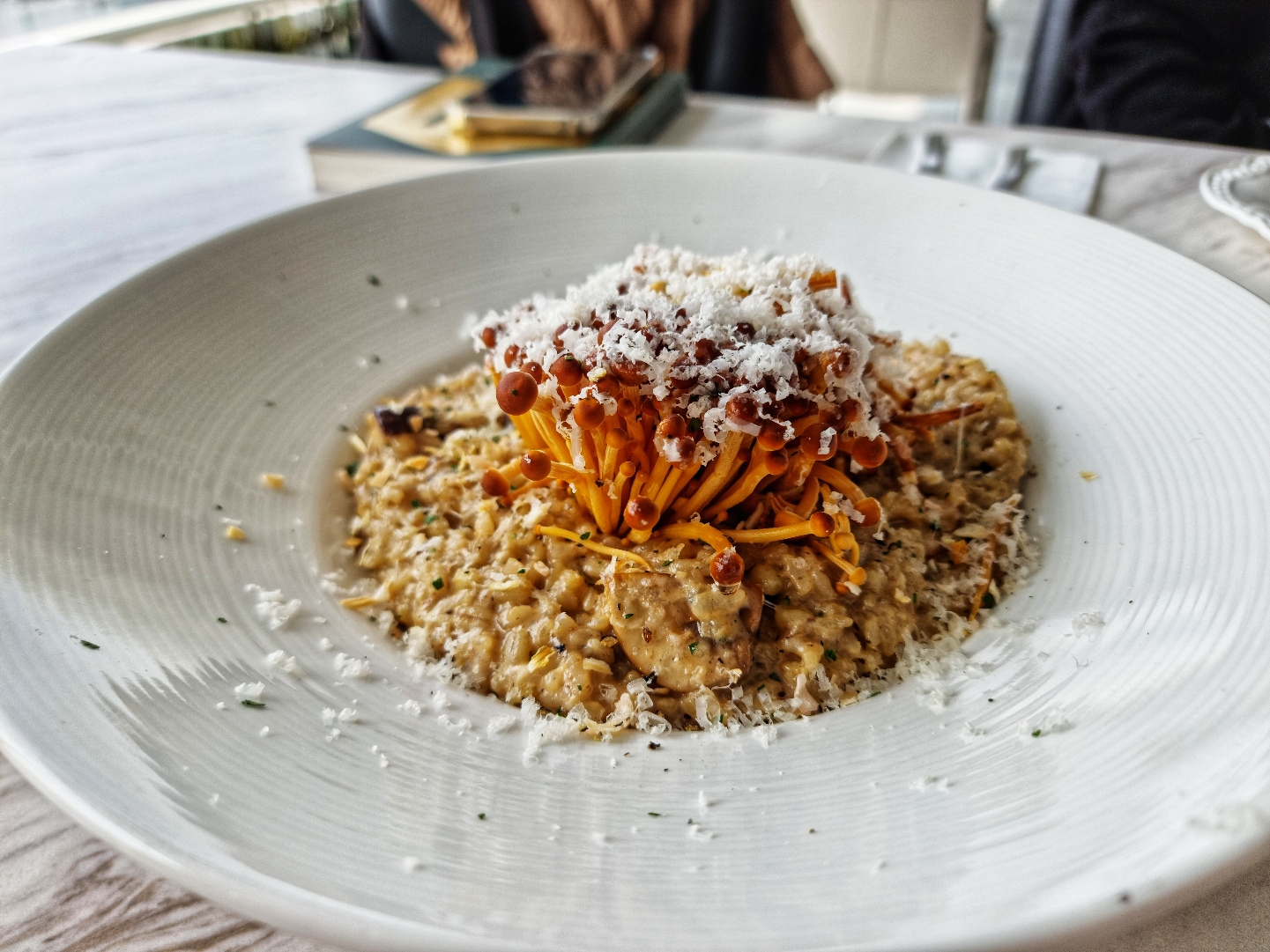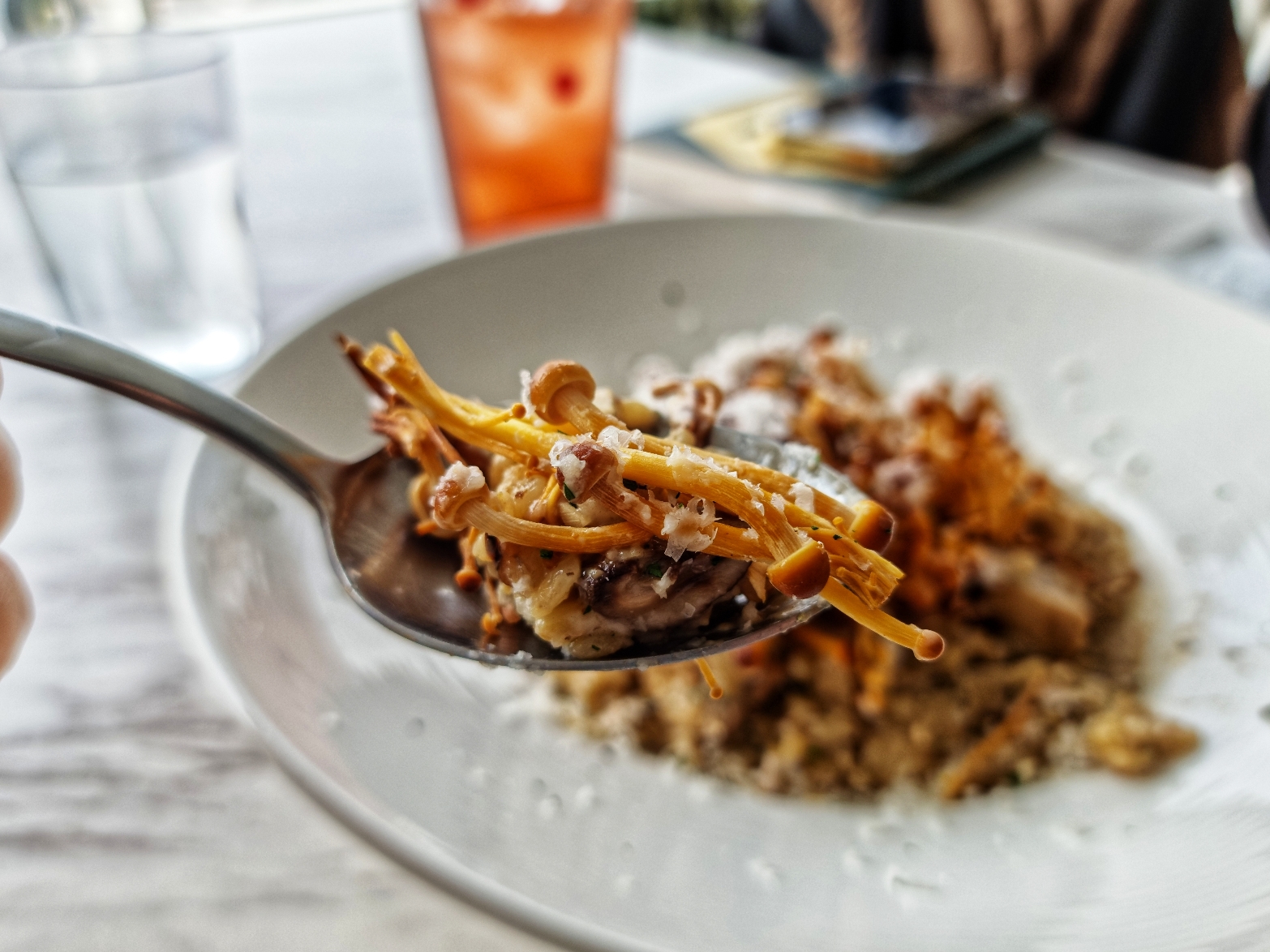 트러플 머쉬룸 크림 리조또는 황금송이, 새송이, 양송이버섯이 들어간 부드러운 리소토이다. 생쌀과 보리의 톡톡 씹히는 식감이 좋다. 부드럽고 고소한 맛에 트러플의 향이 느껴지는데 황금송이의 비주얼과 식감이 재미있는 맛을 이끌어낸다. 리조또 역시 양이 적지 않아 아마트리치아나와 같이 맛있게 먹을 수 있었고 고소한 리소토와 매콤한 아마트리치아나의 조합이 좋았다.