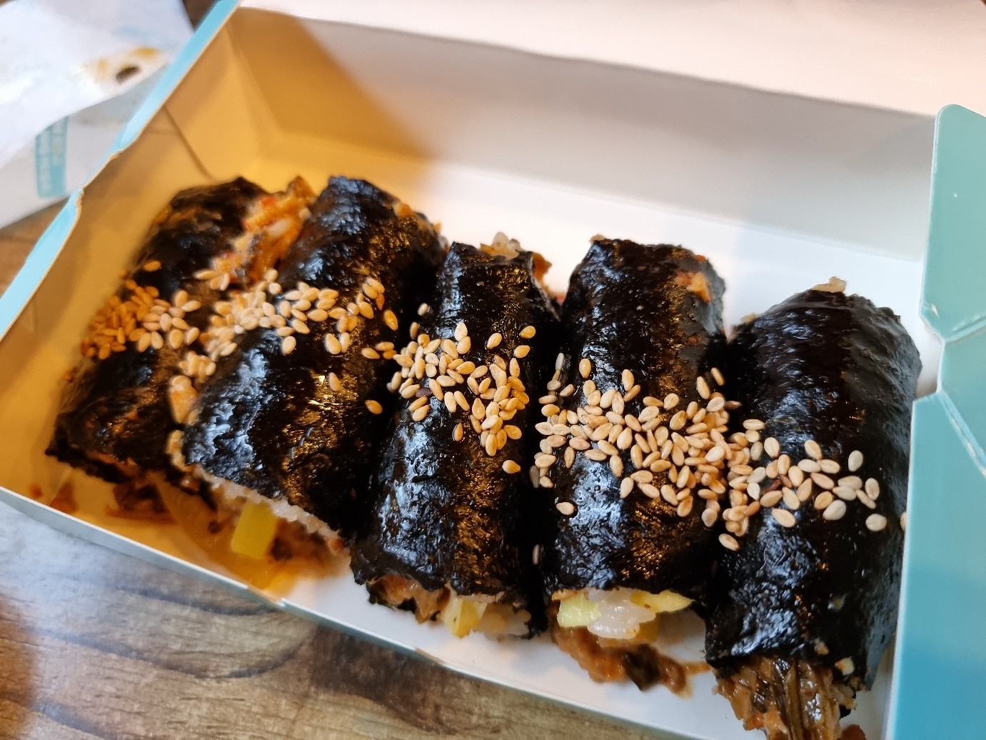 바다김밥은 전화로 예약 주문이 가능하다. 김밥 5개가 1 상자로 갓참치김밥, 계란김밥, 중화어묵김밥 등 다양한 김밥을 판매하고 있다. 종류별로 1개씩 미리 주문을 했는데 토요일 오후 6시 30분 기준으로 사람이 많이 붐비지는 않았다.