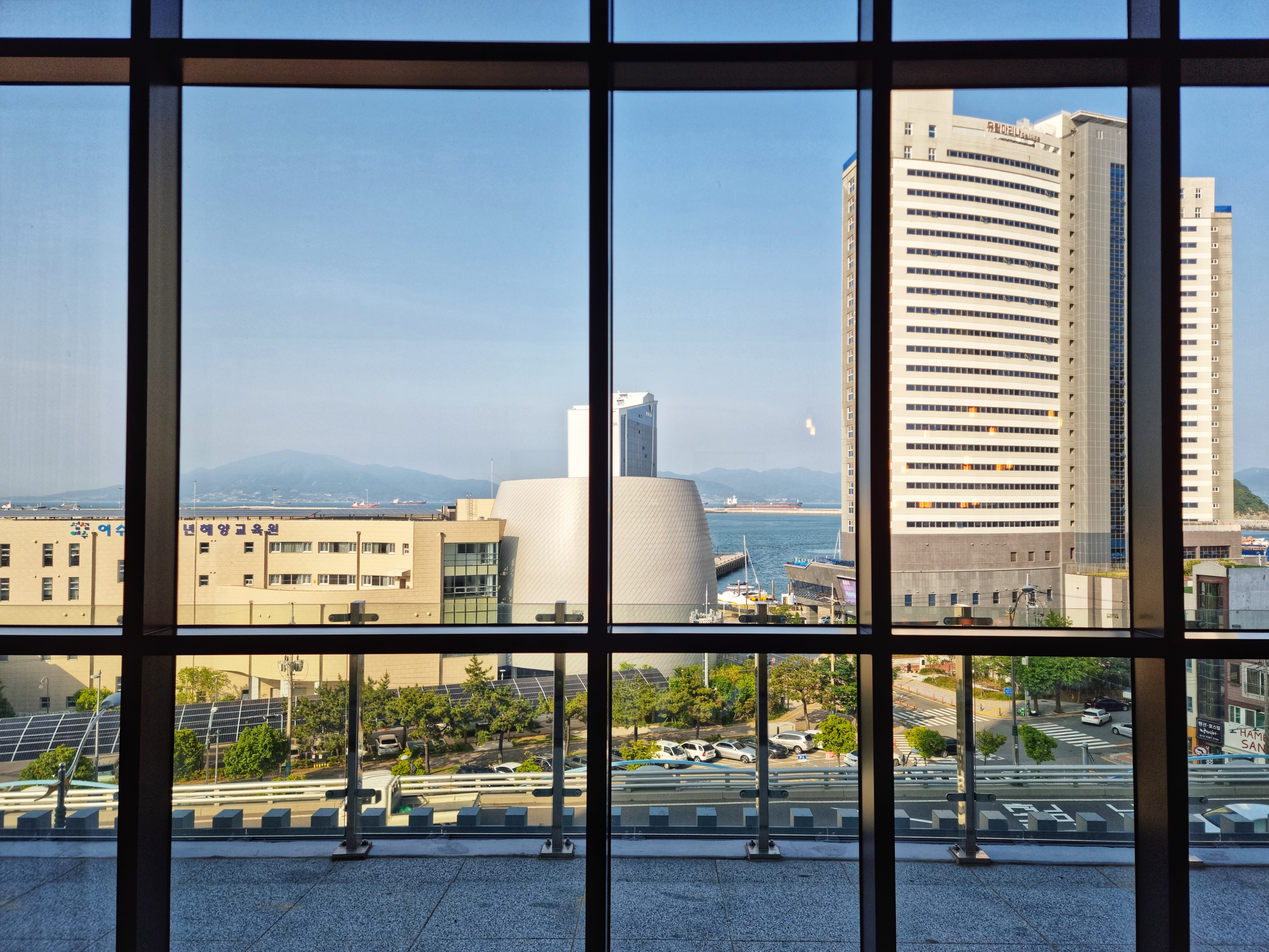 6층 로비에서 잠깐 짐을 내려놓고 여수 엑스포와 바다를 바라본다. 신라 스테이 여수는 여수 엑스포 뒷편에 자리 잡고 있어서 저층에서는 이렇게 건물에 가려진 오션뷰를 볼 수밖에 없다. 객실 오션뷰를 선택했다면 고층에 배치된 객실만이 여수의 바다를 온전하게 볼 수 있을 듯하다.