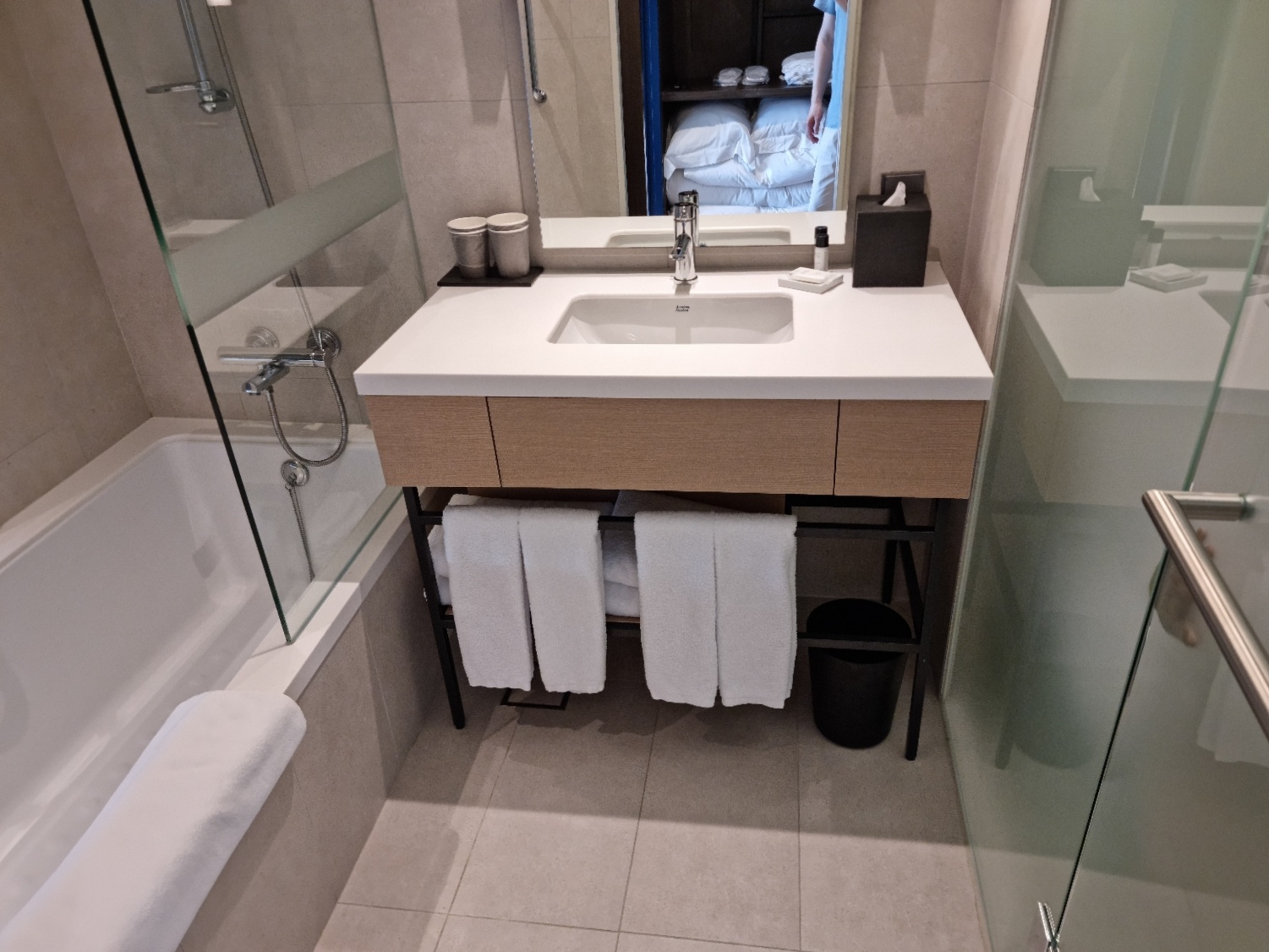 다만 신라 스테이의 공통적인 문제점인지는 모르겠지만 욕실 선반이 없어서 어매니티가 욕조에 올려져 있다. 샤워를 하면서 샴푸/컨디셔너/바디 워시를 사용할 때마다 허리를 굽혀야 해서 매우 불편하다. 그리고 샤워 유리 가림막 폭이 짧아서 어떻게 샤워를 해도 물이 튀는 것을 막지 못한다.