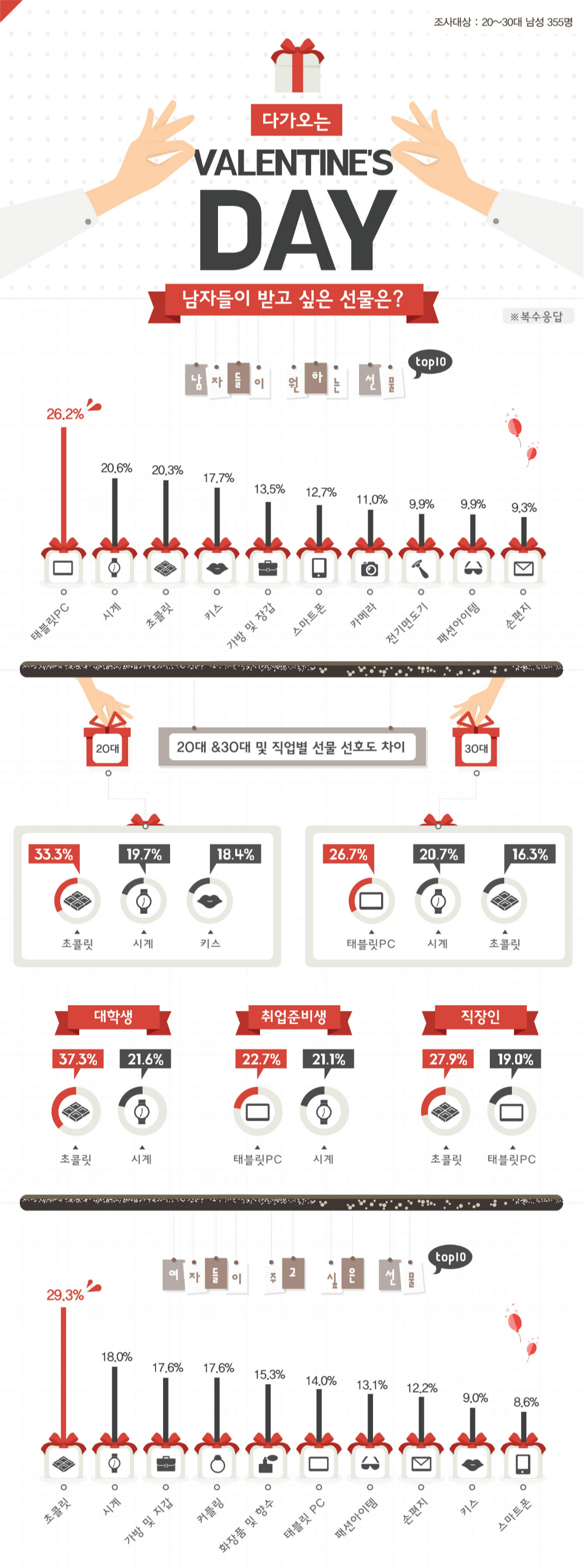 설문조사를 통해 알아보는 다가오는 밸런타인데이 선물 순위에 대하여 알아보겠습니다. 크리스마스도 동일한 이유로 상대방을 만족시키는 선물이 될 수 있고, 추천 선물에 대한 의견을 확인하세요.