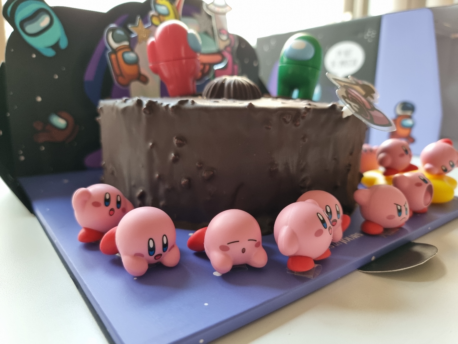 어몽어스 피규어 2개와 어몽어스 뒷배경 그리고 검정 초콜릿 케이크가 잘 어울린다.