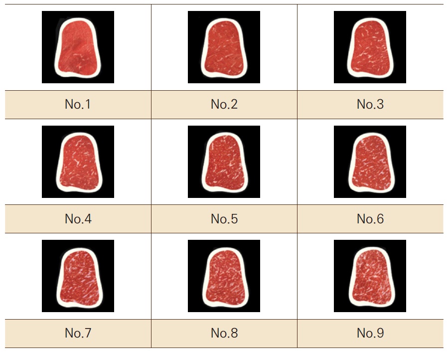 1++ 등급에서도 근내지방도가 15.6~17% 인 경우에는 No.7, 17~19% 인 경우 No.8이고, 19% 이상의 마블링 분포를 보인 1++ 등급의 한우가 No.9으로 등급이 결정됩니다. 정리하면 1++ 등급은 7번, 8번, 9번으로 다시 세분화되고 1++(9) 등급이 최상위 한우 등급이 되는것이죠.